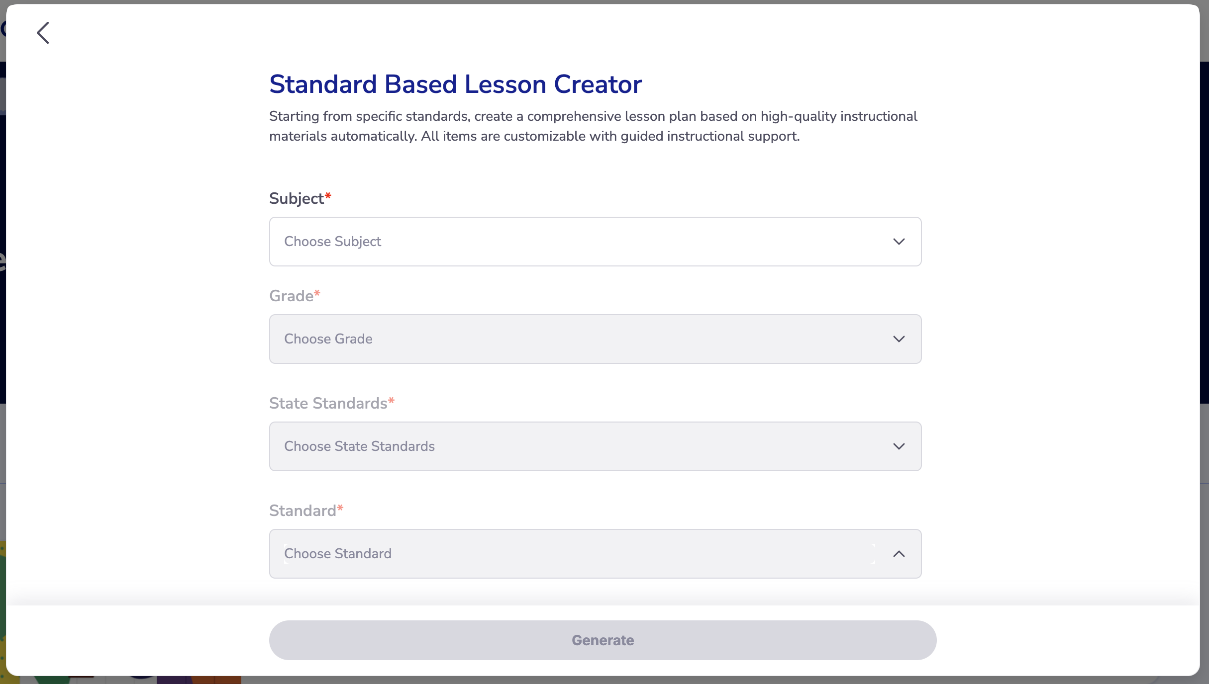 Select the “Standards Based Lesson Plan Creator” app in the Imagine AI popup
